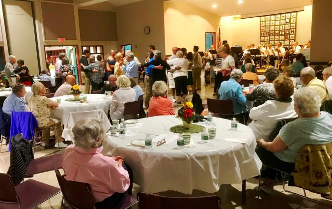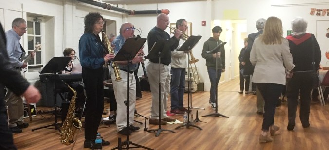 Several members of The Sound Dunes donated their time as participants in Dennis Union Church’s (DUC’s) annual “Talent Show” fundraiser on Sunday, October 27th. The “Sound Dunes Combo” performed several songs including: Hello Dolly, Lazy River, Saints Go Marching In, All of Me, and Girl from Ipanema, the last two tunes featuring vocalist Carole Madru. Members of the combo included: Carole on guitar as well as vocals, Corey Russo on keyboards, Laurie Lang on alto and soprano sax, Ed Wheldon on Clarinet, Bob Sneden on trombone, Bob Aumueller on Bass, Todd Shipman on drums, and Jim Stamboni on trumpet. the Town Hall to celebrate with food, live music by SDSE, and dancing.