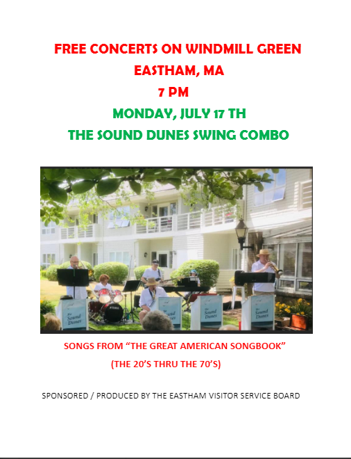 The next public appearance of the Sound Dunes Swing Combo will be this Monday’s FREE Concert on the Eastham Windmill Green at the Bandstand on July 17. The concert will begin at 7pm. The Eastham Windmill Green is located at 2500 State Highway 6 (Route 6) across from the Eastham Town Hall. The concert is sponsored by the Eastham Visitor Service Board. Although the windmill is located in Eastham, it was originally constructed by Eastham resident Thomas Paine in Plymouth in 1680 and is the oldest windmill on Cape Cod.