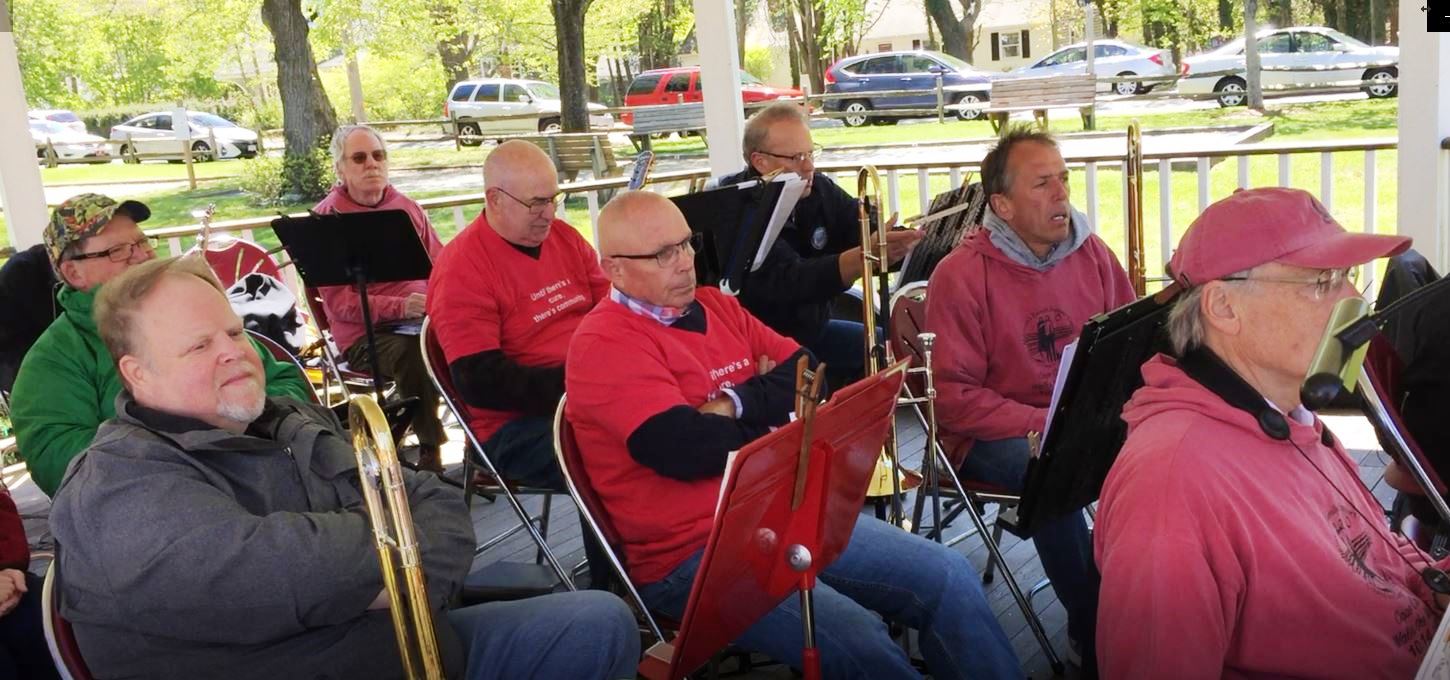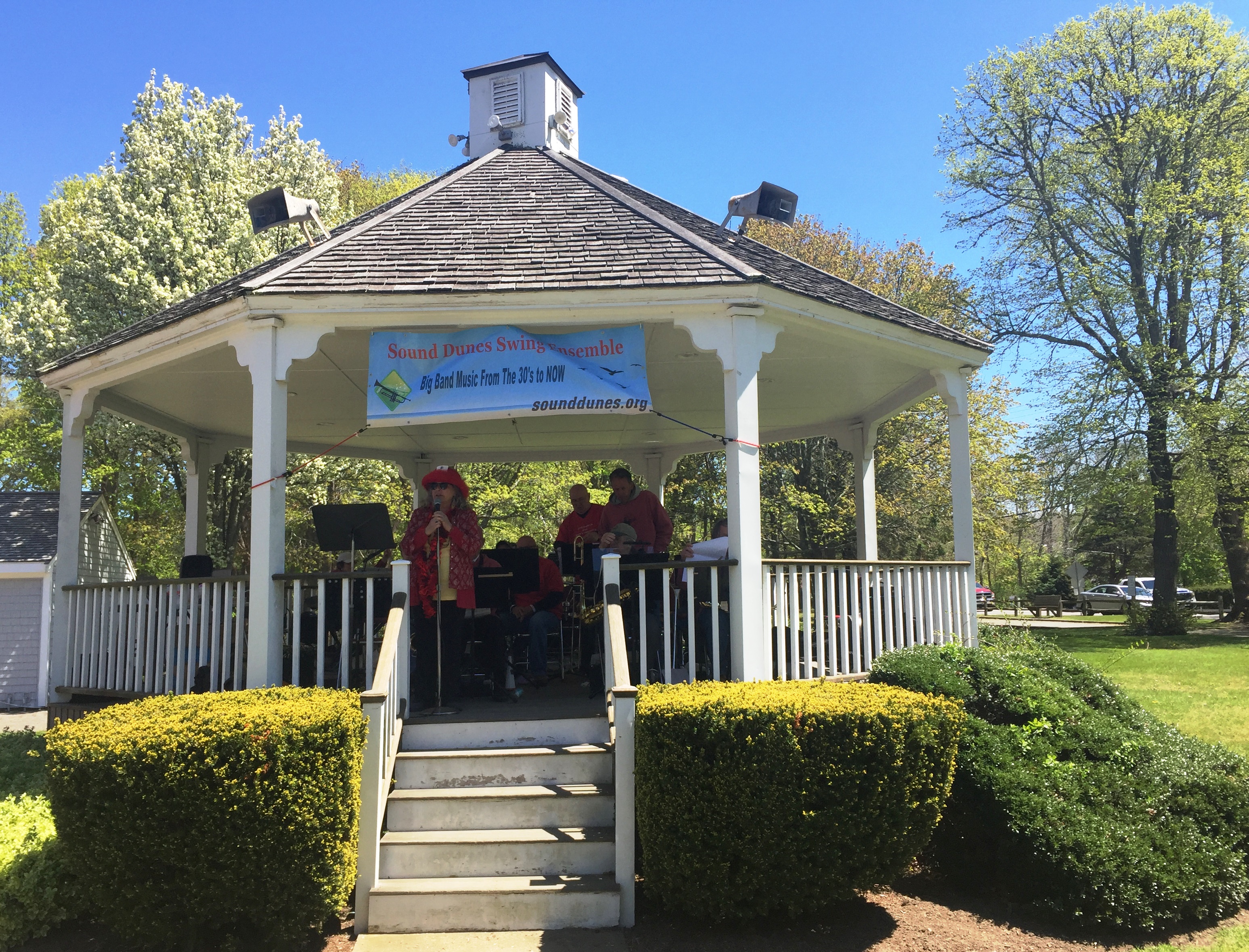 On Sunday, May 11th, The Sound Dunes Swing Ensemble (SDSE) performed during a fundraiser sponsored by The Alzheimer’s Family Support Center (AFSC) of Cape Cod. The band performed on the Harwich Bandstand in Brooks Park which served as the focal point for the event fundraiser and Walk. The weather cooperated for the first time in years since this event has been held, but band members were still a bit chilly on the bandstand (check out the photos)!